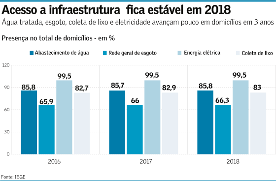 O IBGE detalha que a maioria das residências conta com coleta de lixo, no país. No Brasil, em 2018, o percentual de domicílios cujo lixo era coletado diretamente por serviços de limpeza foi de 83% -- o que abrange 58,9 milhões de residências.